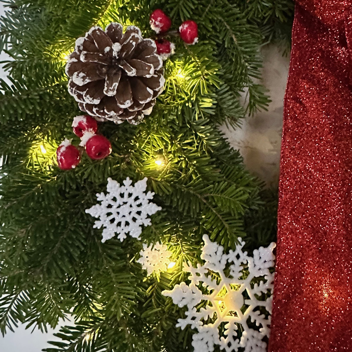 This stunning 24-inch double-sided balsam fir wreath serves as a beautiful backdrop for the exquisite 6-loop wired-edge red glittered bow, which adds a festive touch—adorned with two charming white-tipped pine cones, vibrant crab apple berries, and delicate acrylic snowflakes. To enhance its charm even further, a strand of battery-operated fairy lights twinkles throughout, creating a warm, inviting glow. This wreath is sure to delight and bring holiday cheer to any home.
